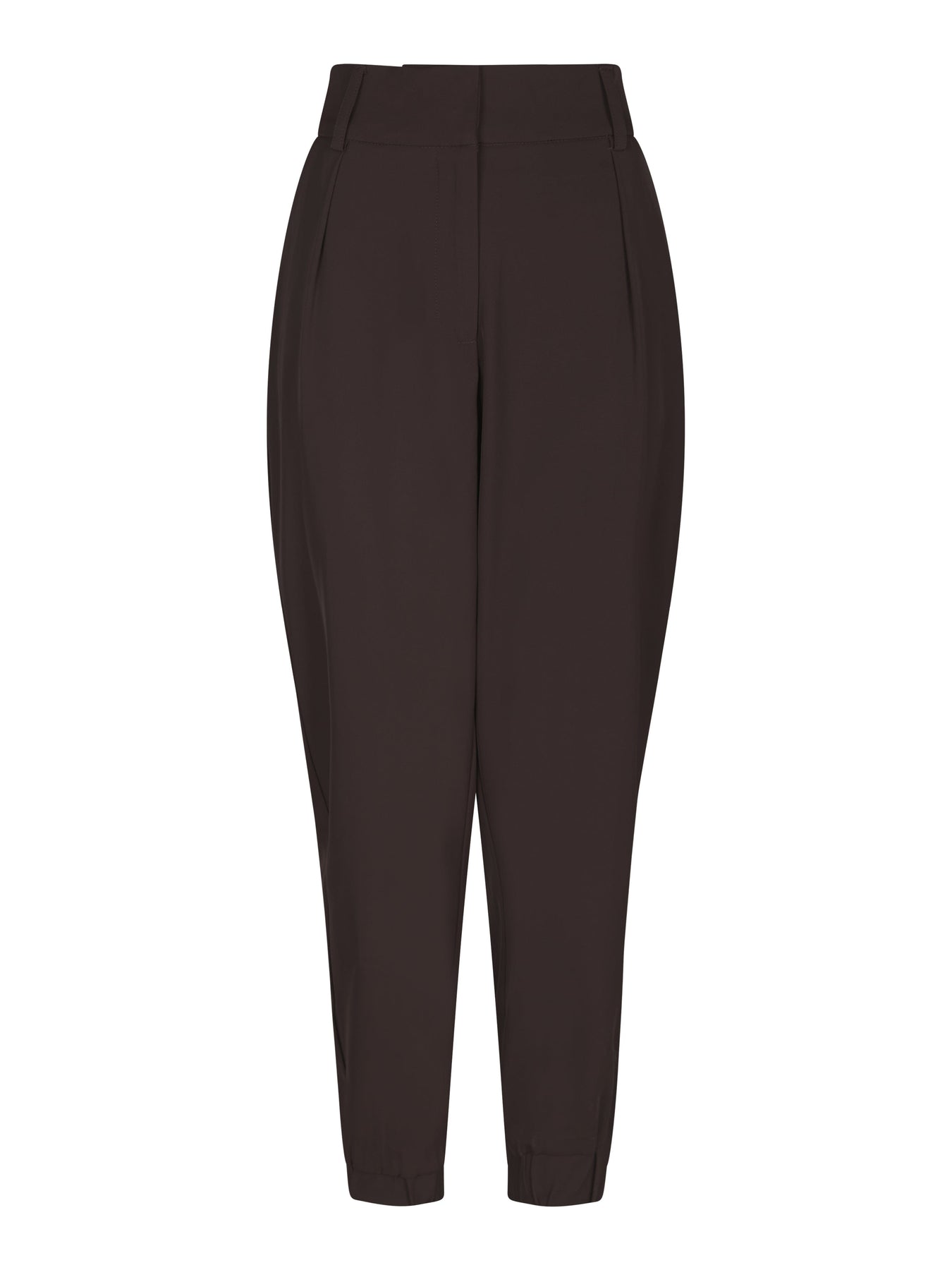 Pantalons marron foncé de Valentin Studio avec taille haute et coupe ample. Les pantalons ont des plis et des poignets élastiques aux chevilles. Ils peuvent être portés pour des occasions festives ou décontractées.