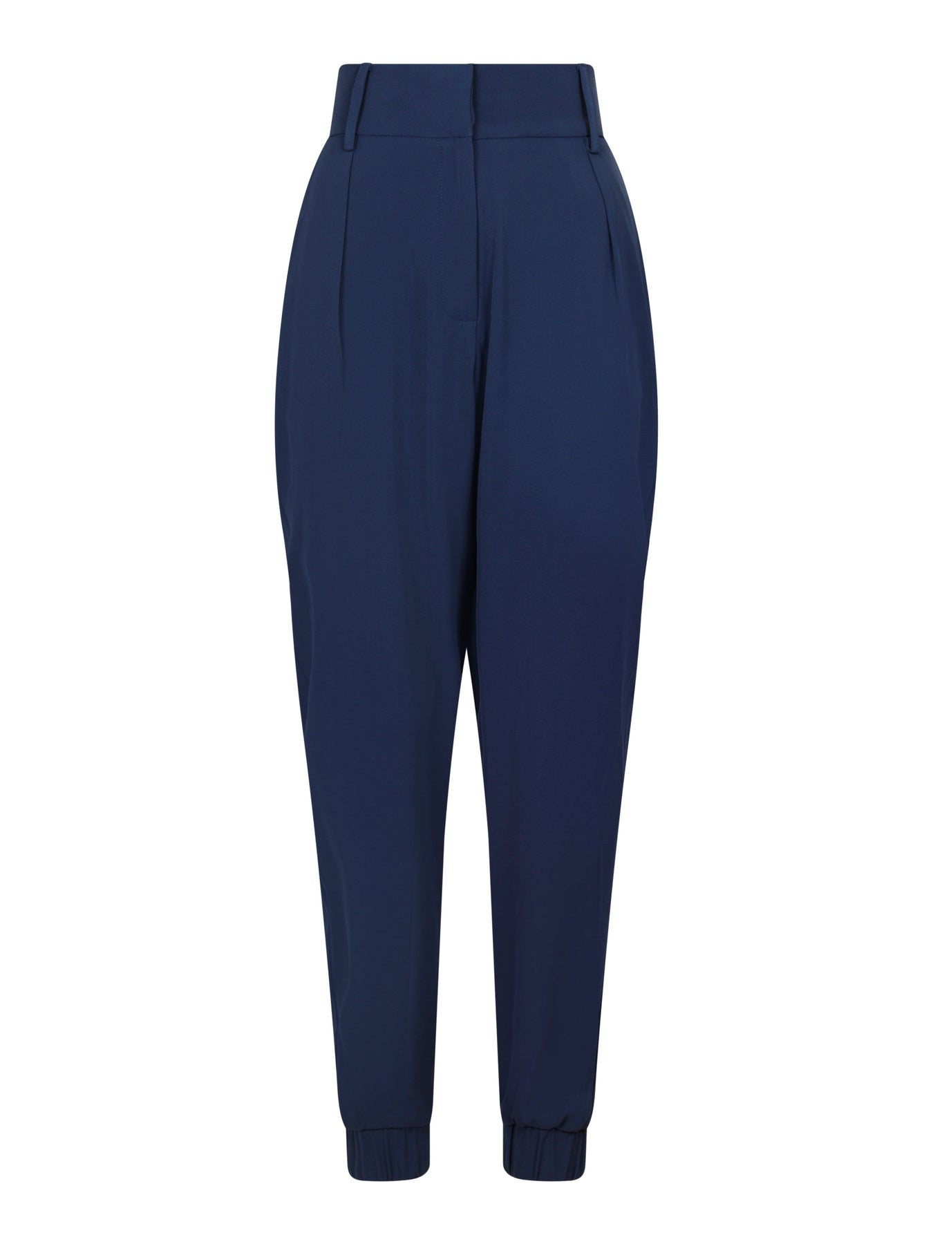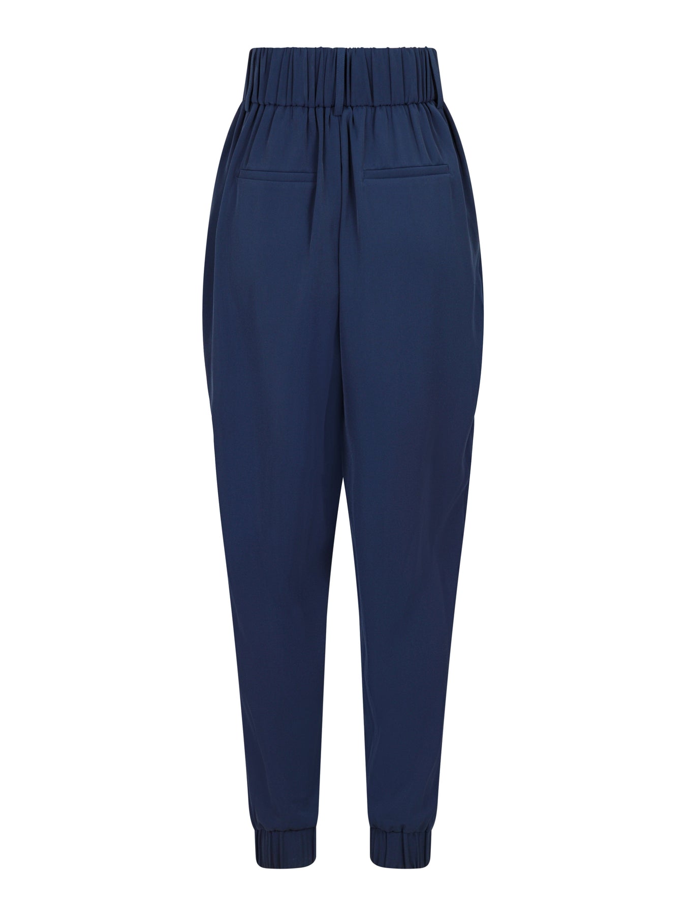 Pantalons bleu marine de Valentin Studio avec drapés à l'avant et élastique à la taille. Les pantalons ont des poches avant pratiques et des poches arrière décoratives qui leur donnent une allure décontractée.