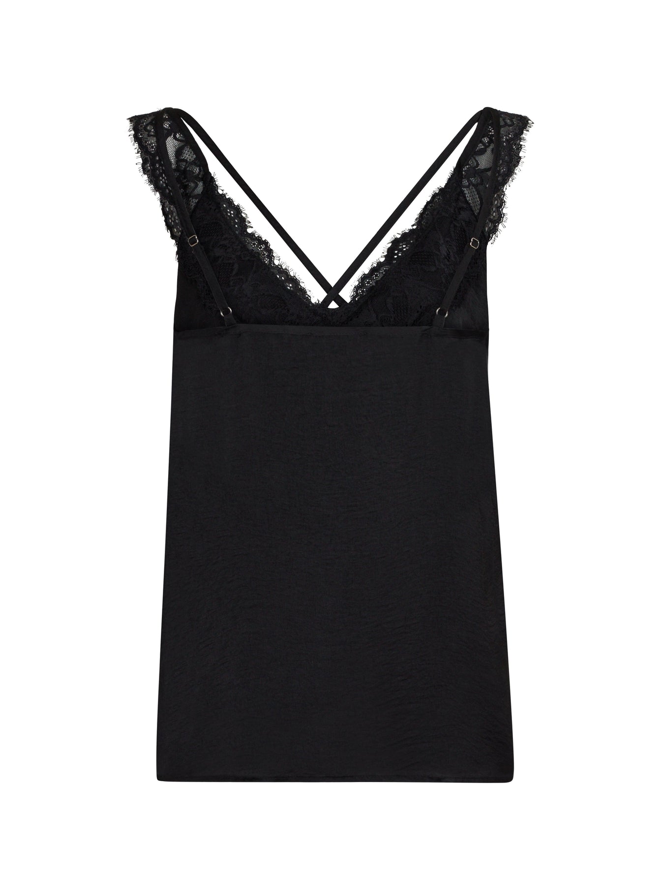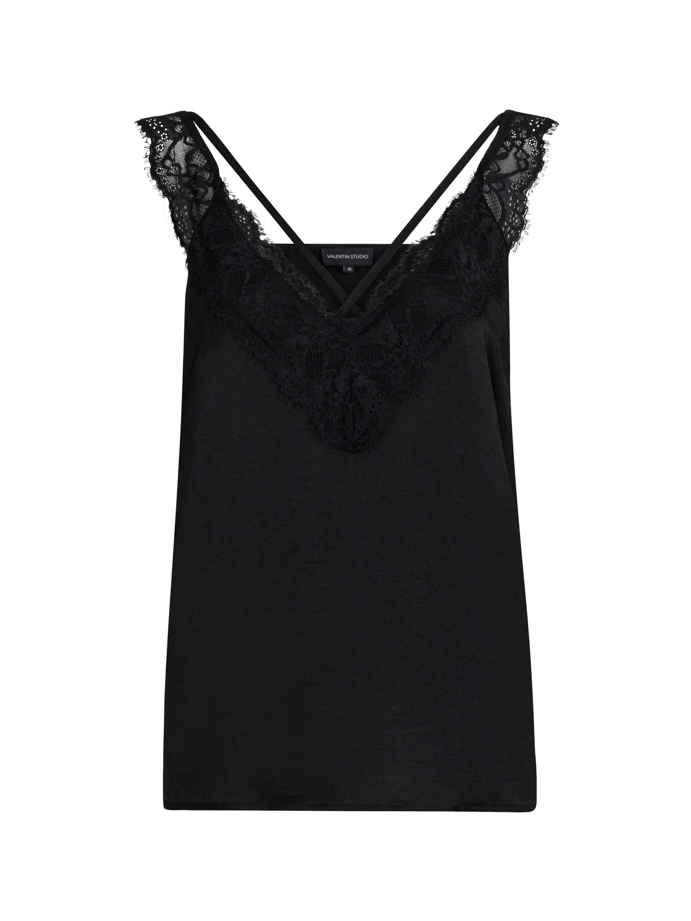 Top noir en string de Valentin Studio avec des bretelles fines et des détails en dentelle. Le décolleté en V et la coupe ample rendent le haut facile à styliser pour différentes occasions.