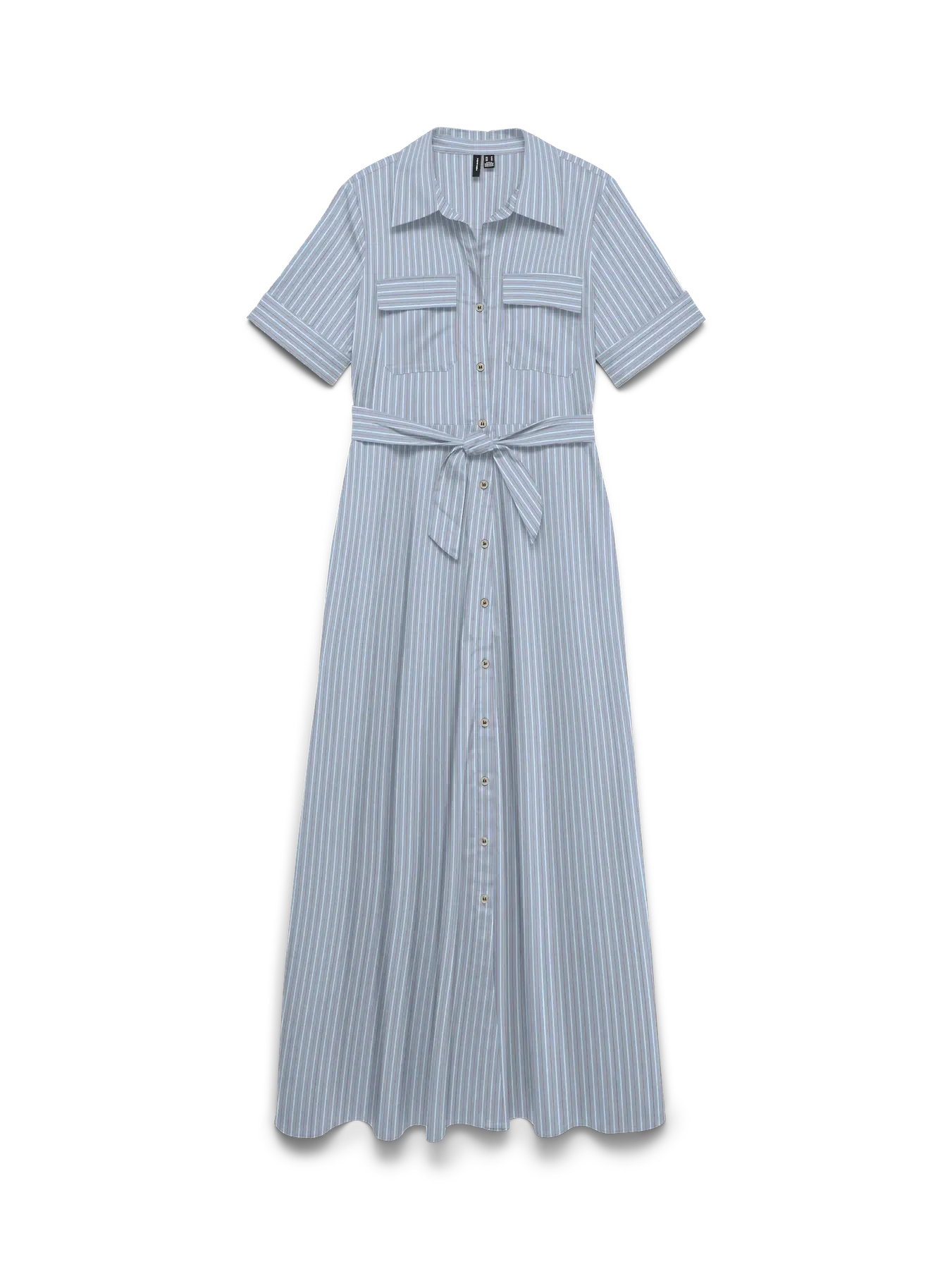 Robe chemise bleu clair de Vero Moda avec des rayures bleu clair. La robe possède un col chemise, une fermeture boutonnée sur le devant et une ceinture à nouer à la taille.