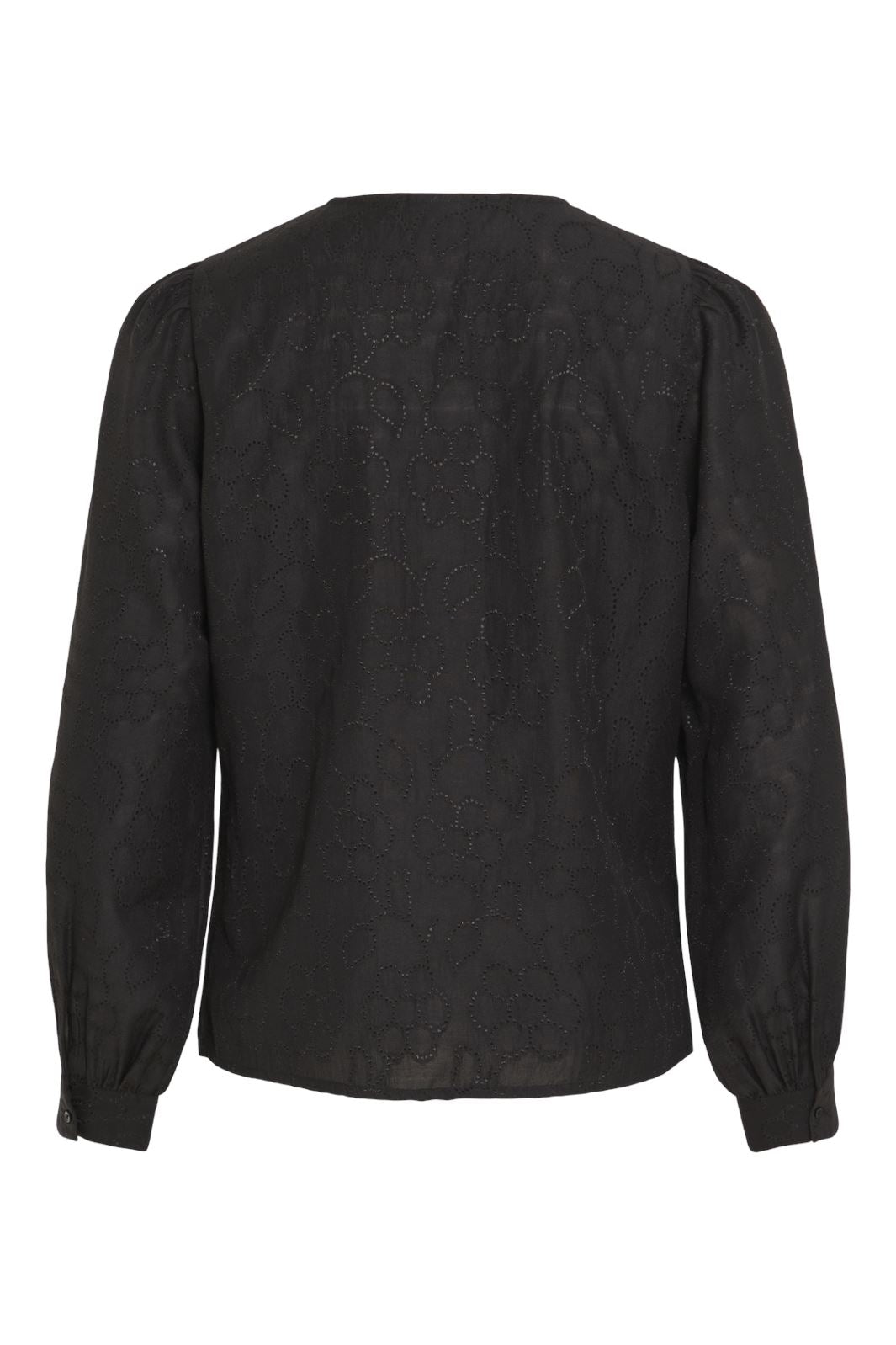 Blouse noire de Vila avec motif floral et broderie. La blouse a un col rond et des manches longues avec des poignets. La fermeture à boutons à l'avant la rend facile à enfiler.