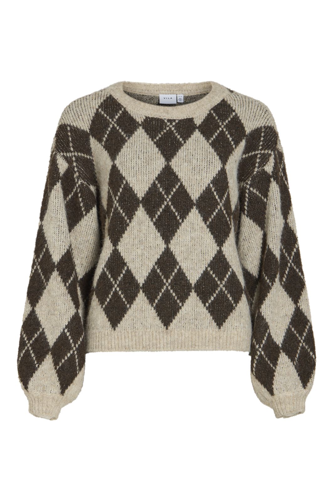 Pull en tricot de Vila avec motif argyle en marron foncé et beige. Le pull a un col rond et des manches longues avec une forme légèrement bouffante.