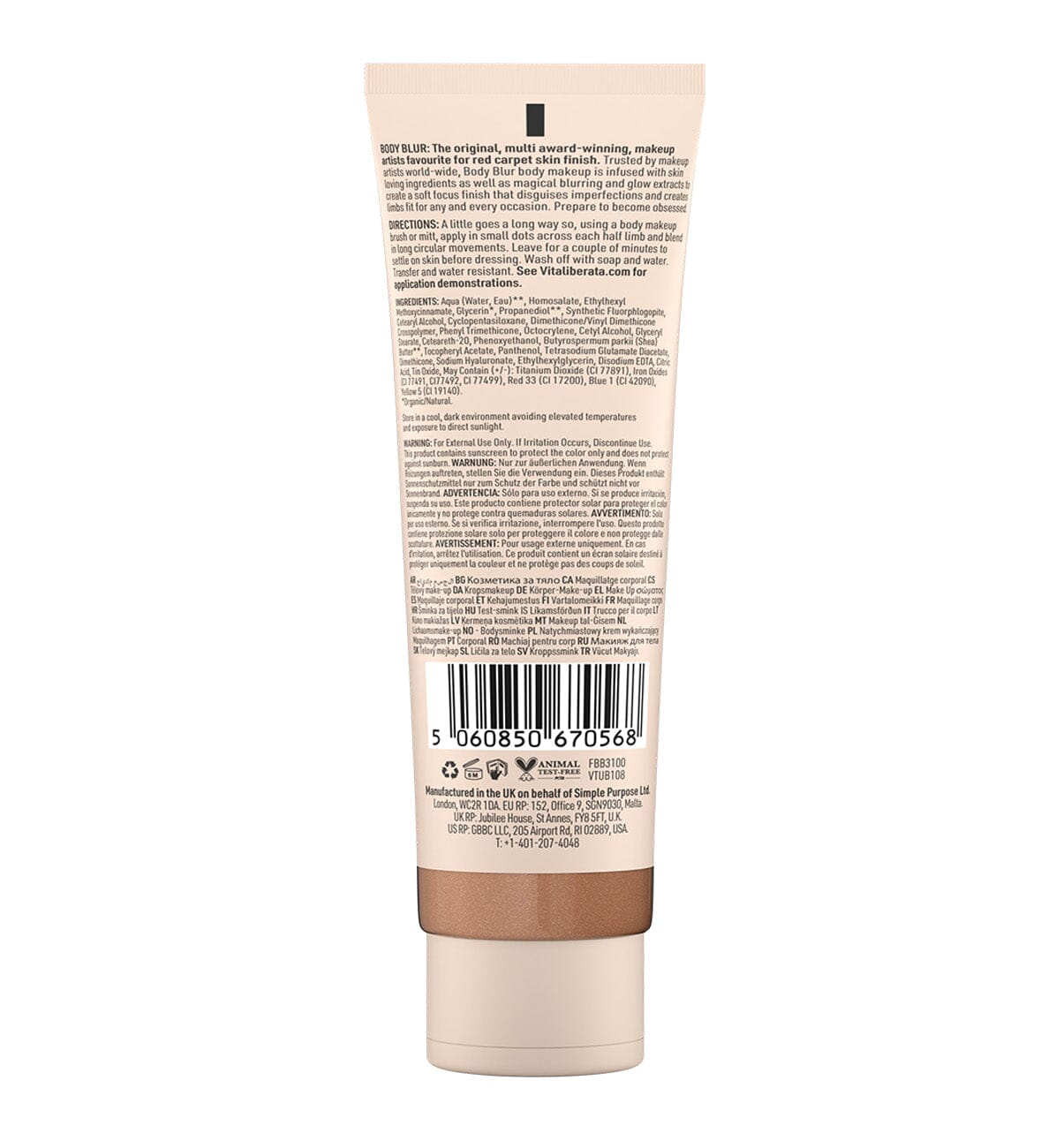 Maquillage corporel de Vita Liberata avec une couverture totale qui masque les irrégularités et donne à la peau un éclat naturel. Le produit dure 24 heures et n'est pas un autobronzant.