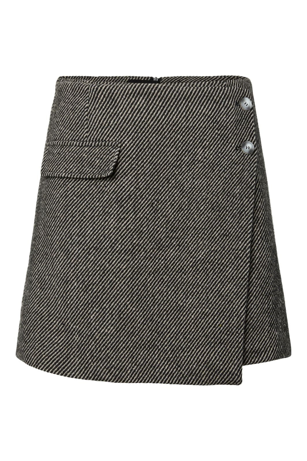 Jupe noire de Y. A.S avec des rayures diagonales. Elle a une taille haute et une poche à rabat sur le devant avec deux boutons sur le côté droit.