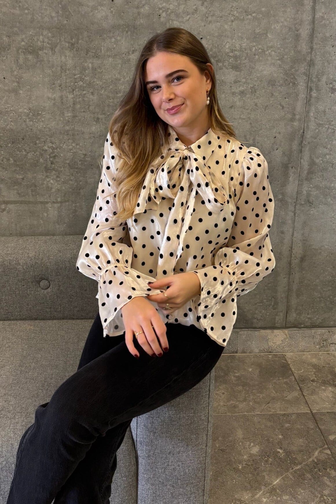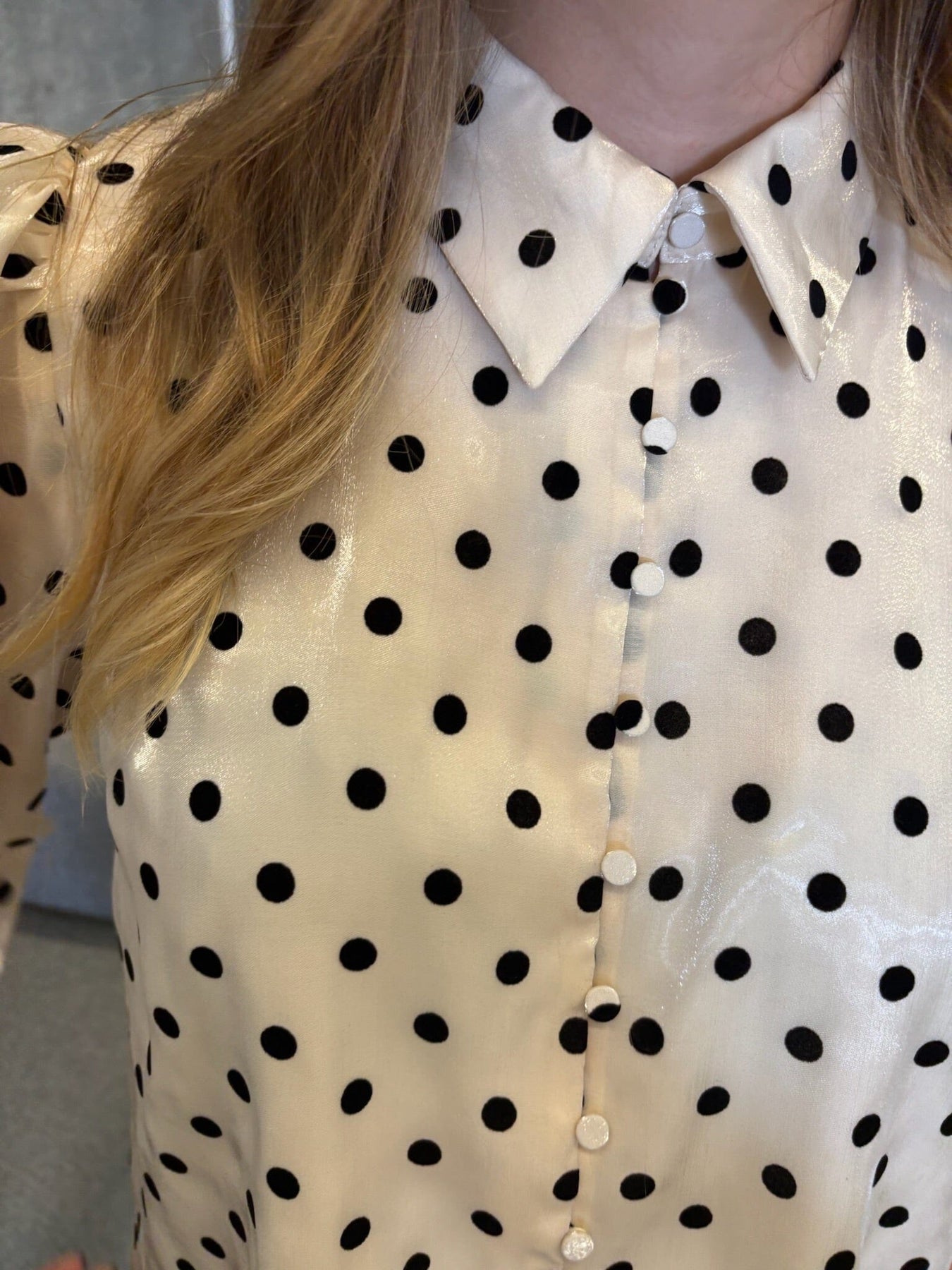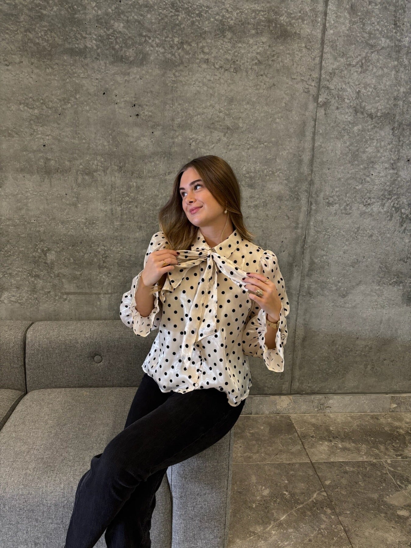 Chemise couleur crème de Y. A.S avec des pois noirs. La chemise a un col de chemise avec un nœud, des boutons sur toute la longueur et des manches longues avec des poignets.