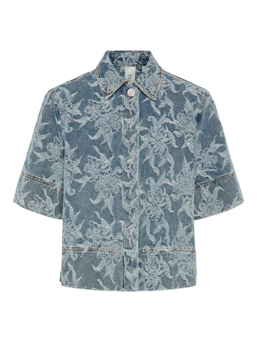 Chemise en denim bleu clair de Y. A.S avec motif floral en dentelle. La chemise a des manches 2/4, un col de chemise et se ferme avec des boutons. Elle est cousue en regular fit.