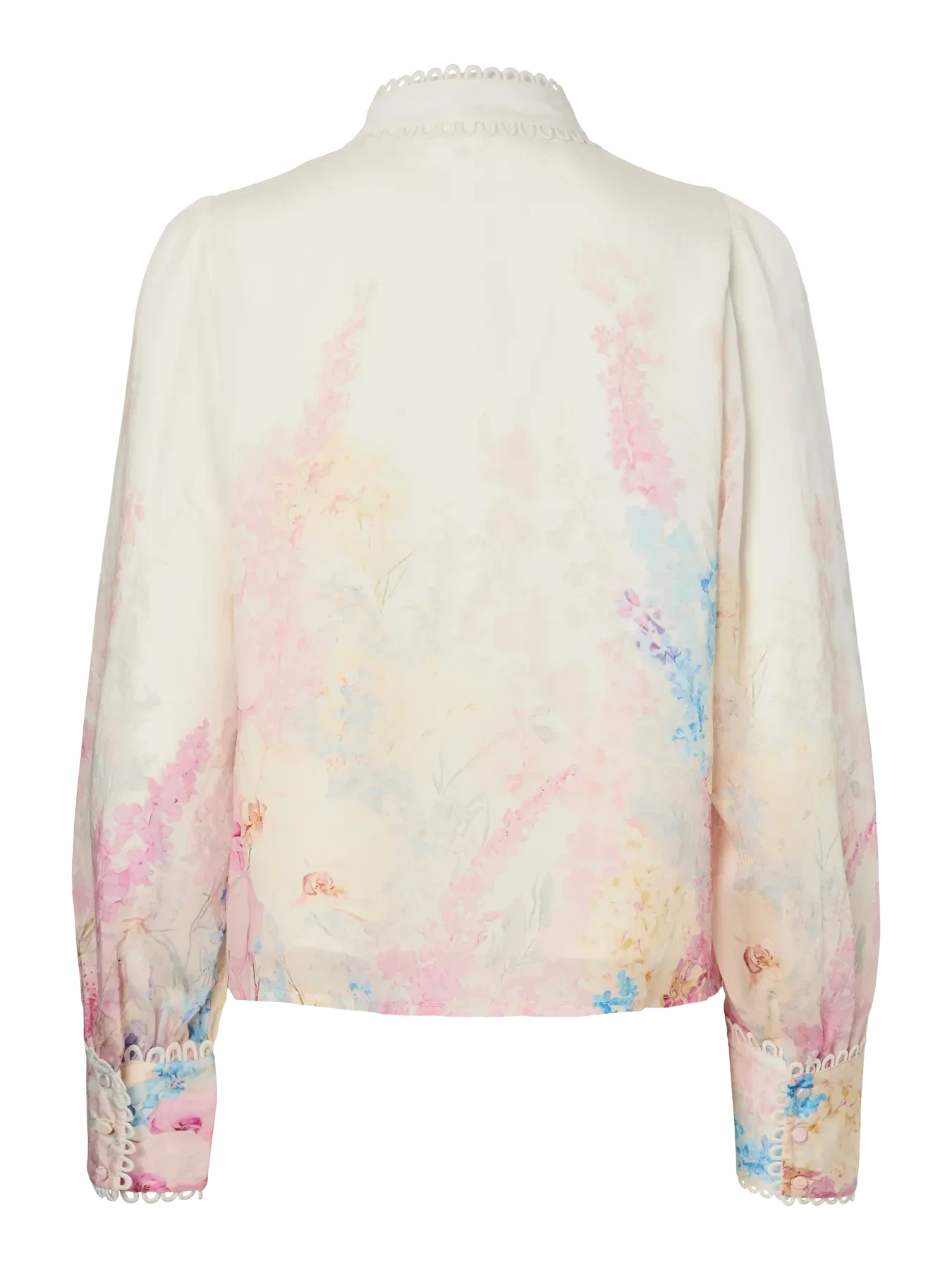 Chemise YAS à motif fleuri rose, bleu clair et beige. Elle présente un col montant et de longues manches avec des bordures en dentelle.