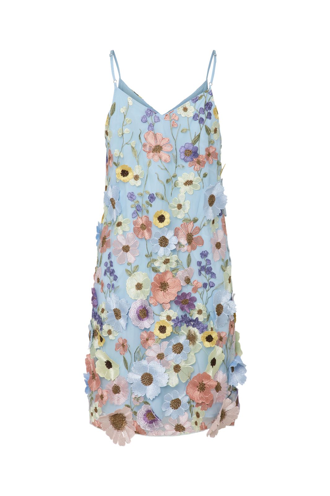 Robe bleu clair de Y.A.S avec des fleurs brodées de différentes couleurs. La robe a des bretelles fines, un décolleté en V et une coupe ample qui offre une bonne liberté de mouvement.