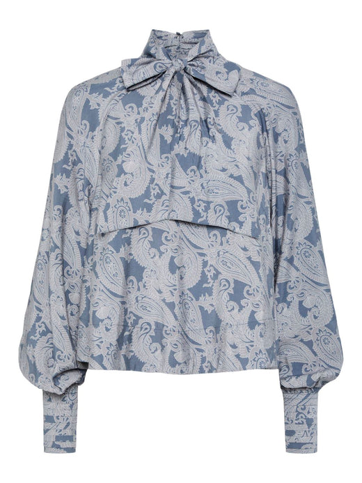 Blouse à manches longues de Y. A.S en bleu clair avec motif paisley gris. La blouse a un col montant avec un nœud et des manches bouffantes avec des poignets smock. Elle se ferme avec des boutons dans le dos.