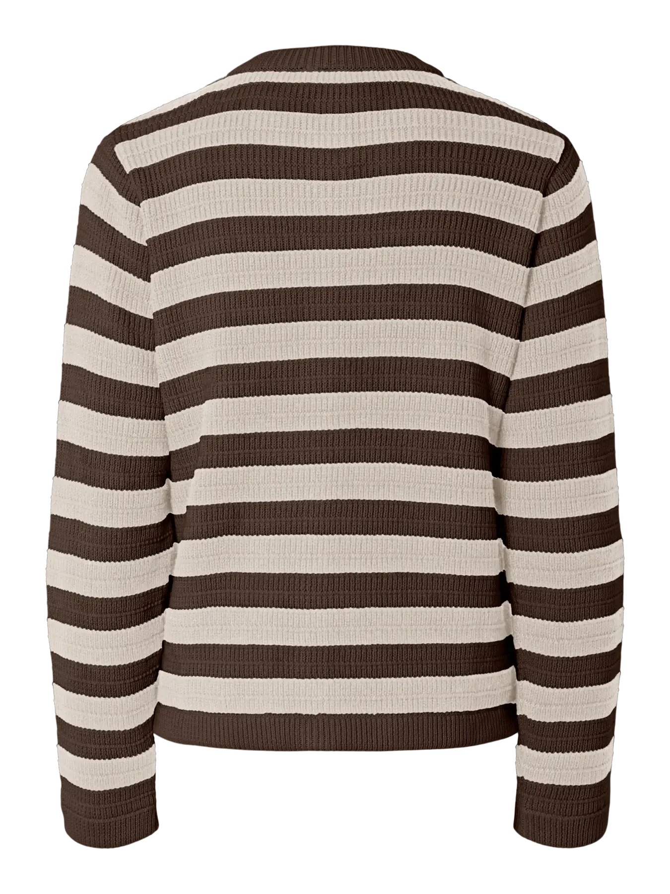 Cardigan tricoté de Y. A.S avec des rayures horizontales en chocolat et beige. Il a un col rond et des boutons dorés à l'avant.