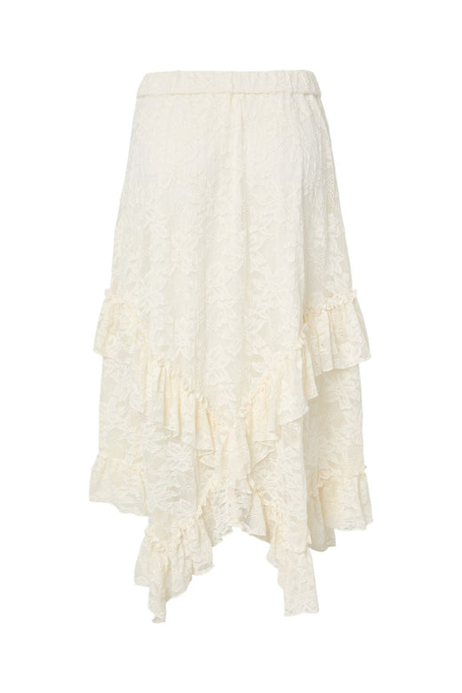 Jupe longue à la cheville de Y.A.S en blanc et crème. La jupe a un motif floral et est fabriquée avec de la dentelle et des volants, ce qui lui confère un design asymétrique avec plusieurs couches.