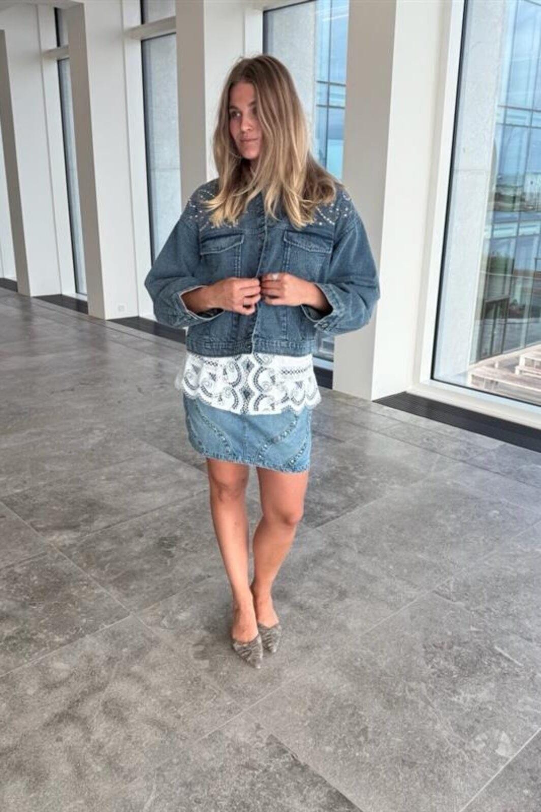 Veste en denim bleu clair de Y. A.S avec broderies et détails en perles. La veste a une coupe décontractée avec un col de chemise et des manches longues. Des boutons à l'avant et deux poches poitrine donnent à la veste une allure classique.