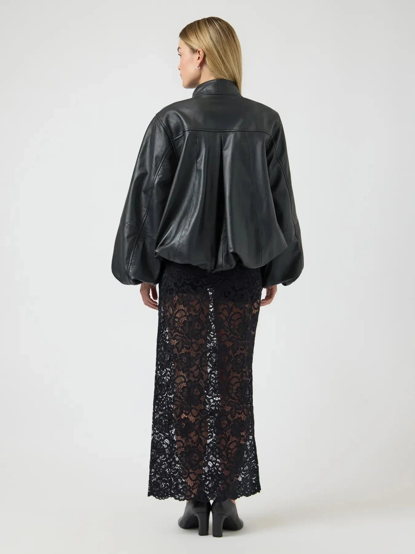 Veste en cuir noire de YAS, fabriquée en 100 % cuir. La veste possède un col montant et des manches volumineuses avec un léger froncement aux poignets.