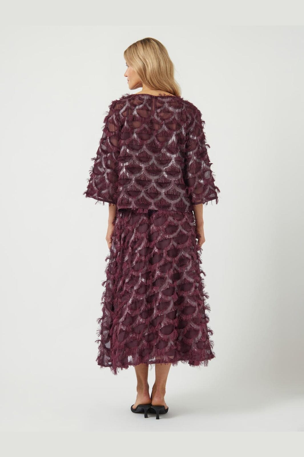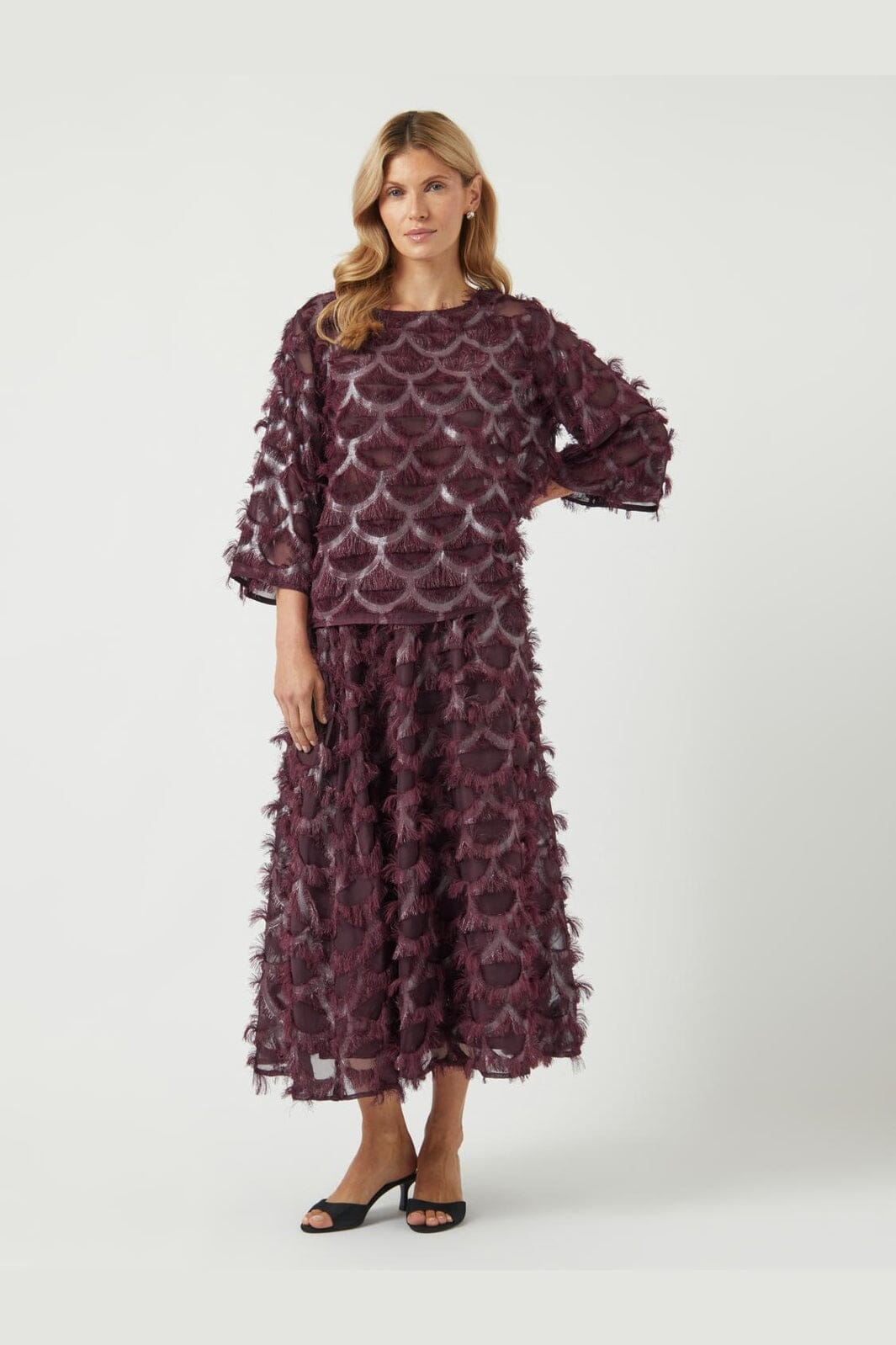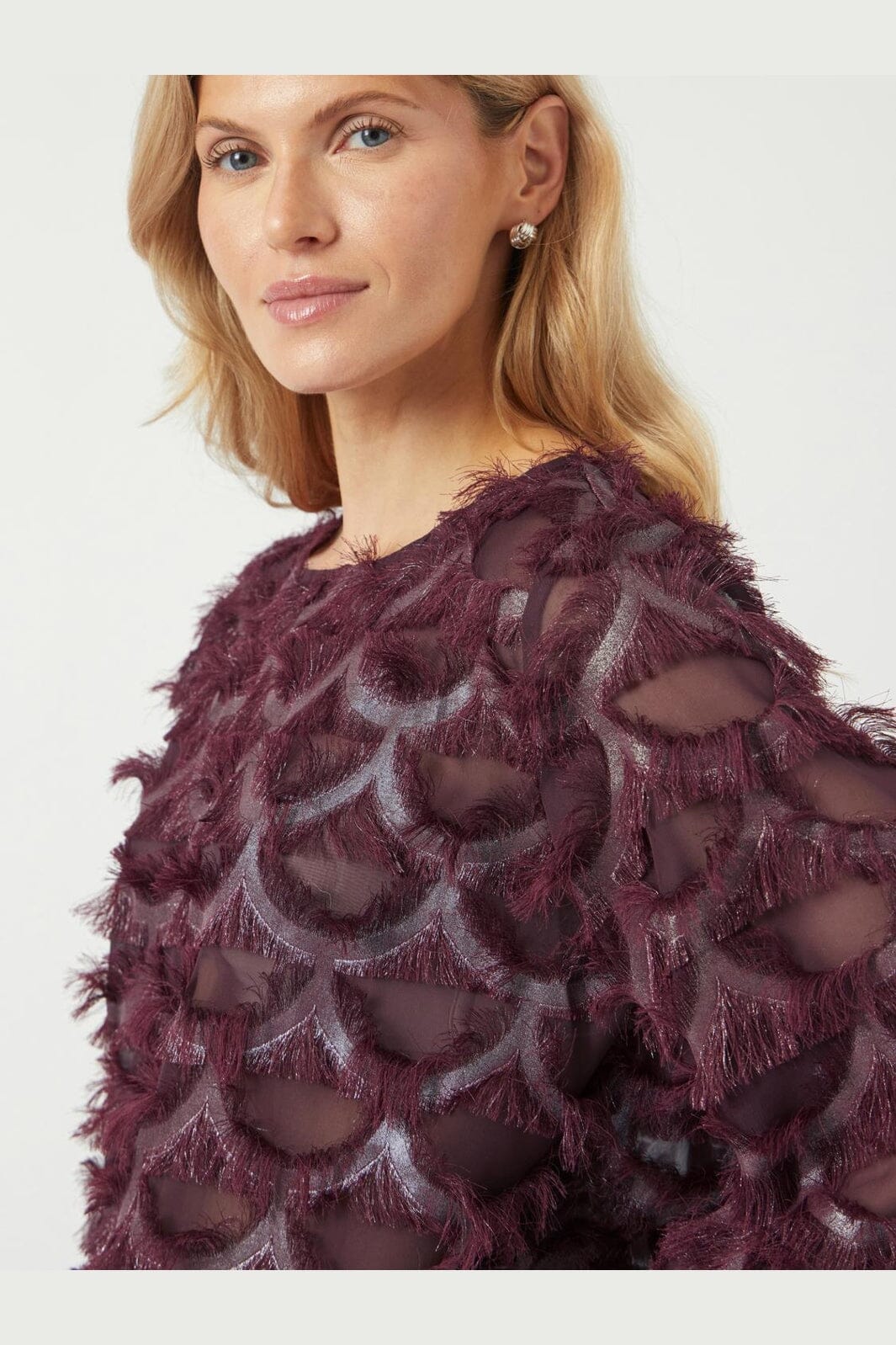 Top de YAS, fabriqué en 100 % polyester dans une nuance bordeaux avec un éclat métallique. Le top présente un motif de demi-cercles avec des franges.