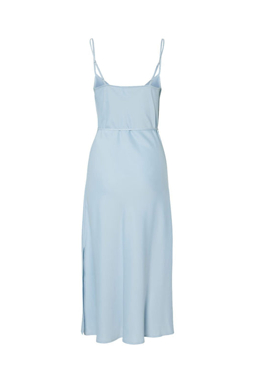 Longue robe bleu clair de YAS avec bretelles spaghetti et détails à nouer à la taille. La robe est fabriquée en polyester recyclé.